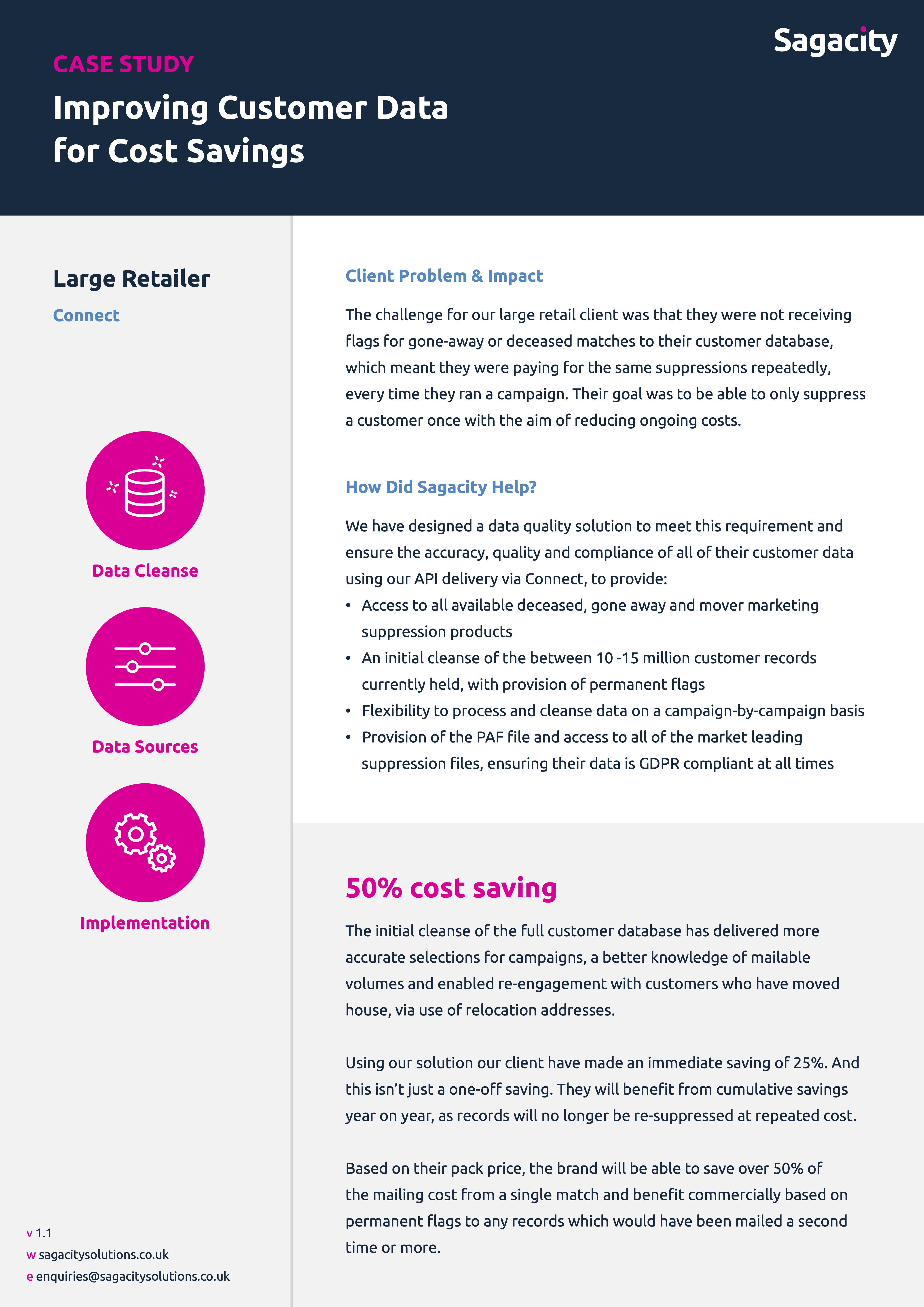 To understand the quality of your data, we offer a free Health Check - an assessment of your customer data to understand how accurate it is and where improvements can be made. Data Security - All files will be transferred securely, and all data is encrypted during processing. Once completed, Sagacity’s team will talk you through the results and the potential costs for any updates that may be required. The report will indicate things such as: How can Sagacity help with data issues (if prompted by the prospect). Problem 1 - Ensuring Data is Accurate and Up to Date in Real Time → helps you achieve Operational Efficiency & Effectiveness Sagacity's focus on data accuracy and compliance can help brands to maintain customer trust, minimising the risks & reduce wasted spending. Problem 2 - Removing duplication & utilising data from other parts of the business to complete records → helps you achieve Seamless Omnichannel Experience Sagacity's solutions can assist in eliminating data silos and ensuring comprehensive customer records to facilitate a smooth integration process. Problem 3 - The ability to deliver highly relevant, personalised and efficient communications → helps your company have Customer-Centric Approach Sagacity's expertise in data-driven personalised messaging can further boost digital engagement, targeting specific individuals, and enhancing the online experience. Problem 4 - Enhancing data to gain deeper insights, enabling communications across as many channels as possible and identifying sales opportunities → helps you Maximise Customer Lifetime Value Sagacity's data enhancement services can uncover deeper customer insights, enabling personalised offers and identifying cross-selling opportunities, thereby driving customer-centric growth. While also enabling brands to engage with their customer across ALL channels by completing customer records missing contact details.